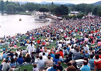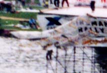 バーリ−グリフィン湖で開催中の「鳥人間コンテスト」。右は写真中央で落下中の鳥の人。