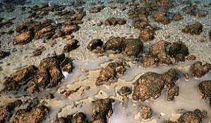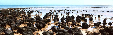 びっしりと並んだ石の表面に生息している。石自体もストロマトライトが作り上げたもの。高さ30cmぐらい。