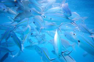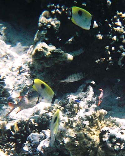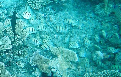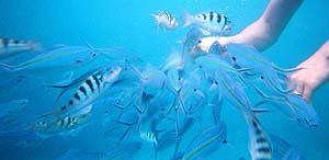 朝食のパンを少々失敬して、ビニール袋に入れてシュノーケリングに行くと、こんな感じ。