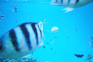タンヴァ島の見える側のビーチ、レセプションから左側のビーチは、海草も少なくてシュノーケリングに最適。ビーチから50mも進めばドロップオフとなっており、魚影が濃い。シャコガイやイカやエイも見られる。