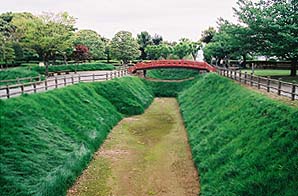![]() 発掘されたと思われる空堀。石垣は無い。他にも模擬天守がありますが、天守台も模擬石垣。 |