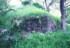 ![]() 山のふもとの石垣。構造はしっかりしているようだが、草に埋もれかけている。 |