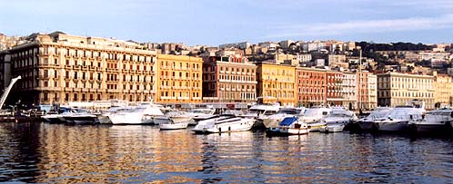 早朝のサンタ・ルチアから見た卵城とヴェスーヴィオ。