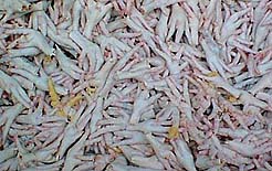 市場の中をうろうろと散歩する。ブタの頭とか、亀とか、とうがらしの山とか。鰻とか、鳥の足(写真)とかを眺める。イカのキムチ(W4,000)とニンニクの芽のキムチ(W3,000)を買う。キムチ屋の人にサービスでヤクルトを貰う。良く見ると他のキムチ屋の奥にもヤクルトが。はやっているのかも。しかし、確かキムチも乳酸菌の宝庫のはずだが、その上ヤクルトを飲む意味があるのだろうか? MESAの前で屋台のつまみ食い。トッポギ(W2,000)と揚げた芋(W500)。トッポギはなかなかいける。餅をとうがらしスープで炒めたもの。