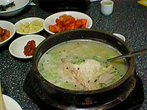 「土俗村(トソクチョン)」では「白いサムゲタン(W10,000)(写真)」と「黒いサムゲタン(W16,000)」があり、一つずつ頼む。白い方は割とあっさりめ、黒い方は少し濃いめの鳥の味。ムシャムシャと鳥の骨をしゃぶる。最後に朝鮮人参酒でしめる。なんだか、強引に健康にさせられているような料理だ。 地下鉄で安国(アングク)へ向かい、仁寺洞(インサドン)の骨董商店街をぶらつく。壷とかタンスを眺める。妻は指輪(W1,000)と魚のキーホルダー(W3,000)を購入。ちょっと疲れたので喫茶店でシナモン茶とシトロン茶。どちらもW5,000。やたらと甘い。口の周りがベタベタになる。お茶はやっぱり渋いものに限る。