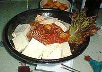 諦めて、せっかく新村まで来て何もせずに帰るのはしゃくなので、ソッテモリという民族居酒屋でビールと豆腐キムチ(写真)でのんびりする。W14,000。 商店街で伊勢海老キャッチャーを眺めてタクシーでホテルに帰る。タクシー代はW4,500。風呂に入って、明日のサウナの予約を電話し、夕食に出かける。