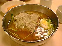 8時頃起きる。タクシーで景福宮(キョンポックン)へ。まずは国立民族博物館。外に怪し気なトーテムポール(写真)が立っていて、ひとしきり遊ぶ。その後、復元中の景福宮を見る。全部同じデザインの建物。ちょっと飽きる。 腹がへったので、タクシーで明洞(ミョンドン)へ。冷麺店「明洞咸興麺屋本店(ミョンドン ハムフン ミョンオク)」へ。辛い冷麺(ピビムネンミョン)と辛くない冷麺(ムルネンミョン)(写真)をひとつずつ頼む。細くて灰色の麺が冷たいだしの入ったステンレスのどんぶりに丸まって出てくる。目の前ではさみでチョキチョキ切られる。何故かと思ってたら、麺が異常に長いようだ。酢をたっぷりかけて食べる。さっぱりしていて、いくらでも食べられそうだ。何故か食べ終わった後、逆に腹がへったような気がする。 商店街を歩いてロッテデパートへ。免税店で妻が化粧品購入。一通りブルガリとか「見るだけ」して、地下食料品売り場へ。キムチをしこたま買い込む。