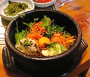 12時半頃に、昼ご飯を食べにビビンパプ店「全州屋(チョンジュオク)」へ。人気のある店らしく、日本人団体も含めて長蛇の列。腹がへってダウン寸前だったので、20分程待つ。2階の一番奥の日本人ばかりの部屋に通されて、キムチをつつきつつビール飲んで石焼きビビンパプを待つ。このキムチ&ビールは食事前の定番。