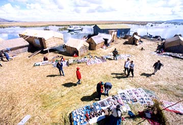 ウロス島の風景。葦を積み重ねた浮島。大小40の島に今でも700人が生活すている。 この島には学校もある。