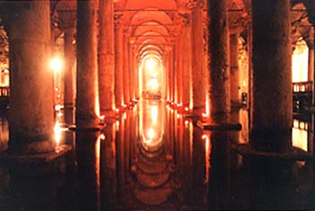 特徴:ローマ時代に作られた地下の貯水池跡。縦140m横70m高さ8m。360本の柱で支えられている。メドゥサの彫刻の頭を柱の土台に使用している所が有名。
